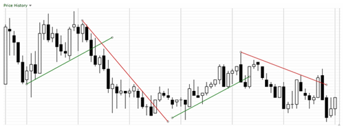 - Trendlines go above the prices for a downtrend (think of this as holding prices down)