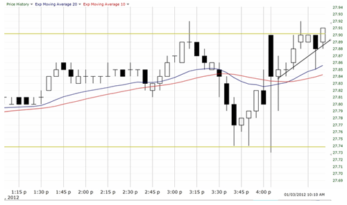 Recall that we went long at $27.91. This is a slow moving stocks and after a couple of hours we are up 9-10 cents. We knew we were picking a slow moving stock since we screened for stocks with 50 cents of daily volatility or less. We have already witnessed a 30 cent range so we won’t be expecting too much of a massive move from here. When will we sell this for profit?