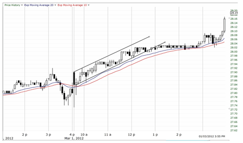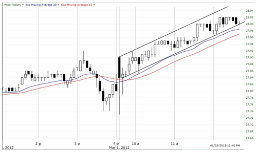 In the first half of this two-part article we screened for a suitable stock, looked at previous support and resistance levels and formed an upward bias based on the 10 and 20 period moving averages on a 1 minute chart. Next we want to look at trendlines as well as the 10 and 20 period moving averages on the 5 minute chart.