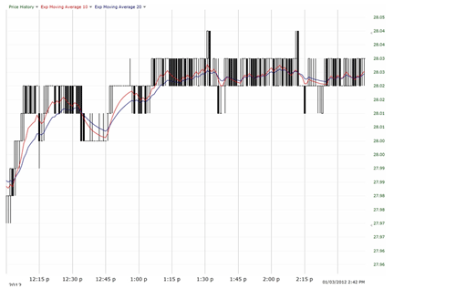 What about using the 10 and 20 period moving averages on the one minute chart? Because the prices on this stock are moving so slowly, the strength of the moving averages are rendered moot. The stock is trading up a penny and down a penny with these short-term moving averages trading in a whipsaw fashion with no real value.