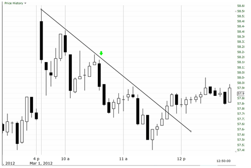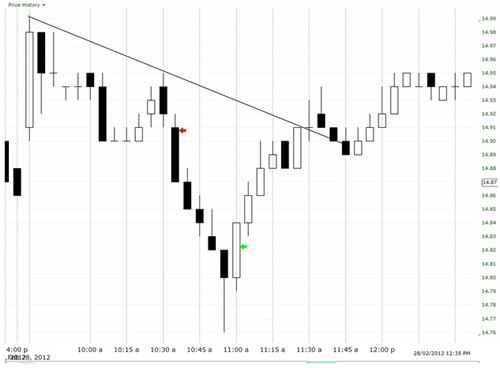 The 5 minute chart pretty much speaks for itself. By about 10:30 when prices come back up to touch the trendline you are thinking of a short play. You short on the long black bar at $53.14 as the previous bars low is taken out. Around $57.79 - $57.80 the downward trend is broken up through and you exit your position with a $65 profit for every 100 shares traded.