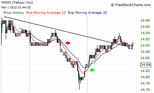 Imagine that we entered based on the 5 minute chart and went short at $14.90. But we didn’t know when to exit. We didn’t discern that we should use our two bar rule. So we sit on this trade. Suddenly the 10 ema (red) crosses above the 20 ema (blue) on the 1 minute chart. Now we should lean towards a bull move.