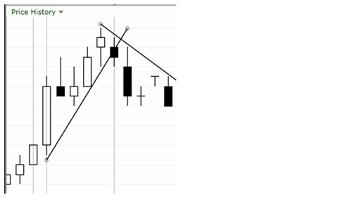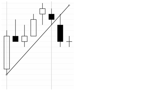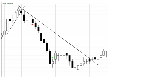 However, you never get a bounce off your trendline as prices now switch to trading lower. Your trendline is broken. Will you take this big black bar as a short trade? Maybe the stock is simply making a less steep trendline. What will you do?