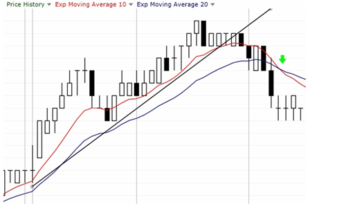 On every pullback the moving averages cross. This tells us that the trading is volatile and the moving averages crossing over will not be a great exit signal. We wait until prices break above the trendline as we passively note that the 10 ema is above the 20 ema on our exit. Click here for Intermediate Setups and Creating a Bias PART 2
