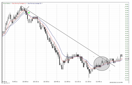 The chart above is Yahoo on February 29th, 2012. You watch the stock for the first hour of trading and at 10:35 you are able to draw a trendline and place a trade as prices take out a previous low. You might also note that at 10:05 it was also possible to draw a steeper trendline and short at an earlier point. We will stick to the trade at 10:30 though.