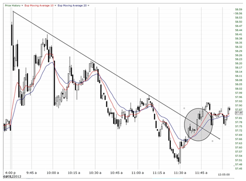 On the 1 minute chart we can still see our trendline along with the entry and exit points. As a general rule (and I do mean general as in not a law by any stretch), when the 10 period ema is above the 20 ema on the 1 minute chart you should be leaning toward long positions. When the 10 ema is below the 20 ema you should be leaning toward a short position.